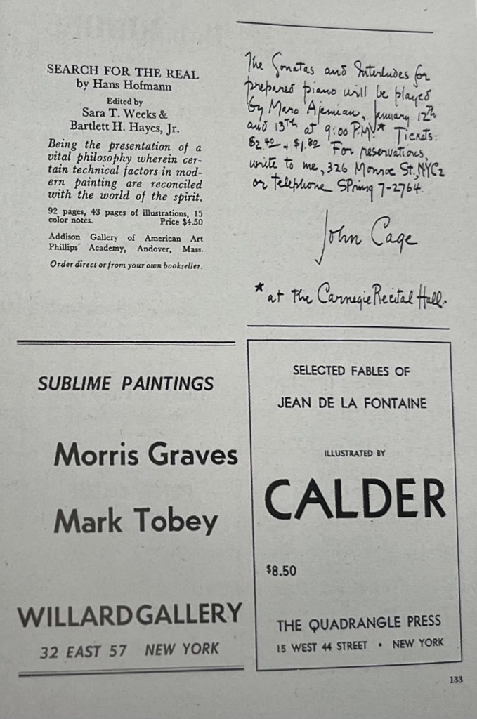 John Cage, a renowned composer and musical theorist, held a significant presence in the avant-garde movement, particularly in the post-war era. His innovative and boundary-pushing approach to music and performance art made him a prominent figure in the art world of his time. As evidenced by the advertisement for his upcoming show in The Tiger’s Eye magazine, Cage’s involvement with the publication underscores the convergence of influential artistic figures within its pages. This connection between Cage and the Stephan’s reflects the publication’s role as a platform for avant-garde expression and its engagement with influential cultural figures of the era.